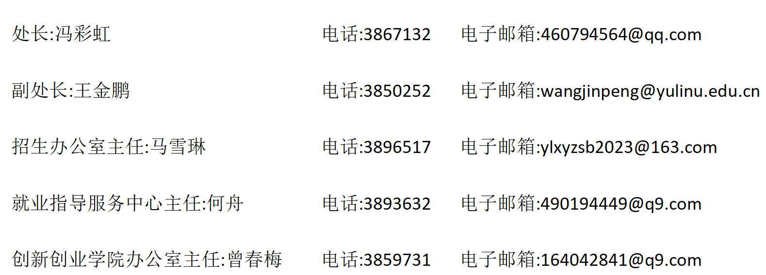 榆林学院招生就业处 电话:0912-3893644 招生电话:0912-3896517 地址:陕西省榆林市崇文路51号 邮编:719000